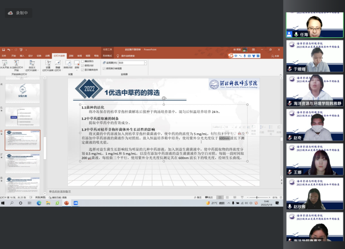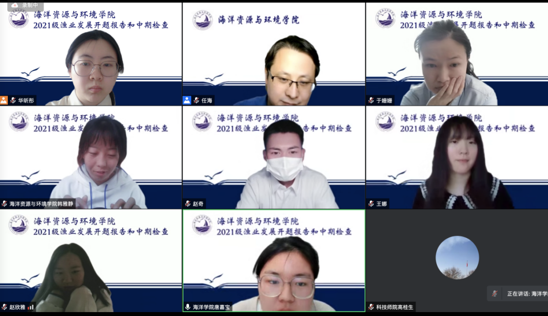 2022年5月18日上午,我院召开2021级渔业发展专业学位研究生中期检查暨开题报告会。该届渔业发展专业研究生是我院自成立以来首批招收的硕士研究生,学院对研究生的论文开题工作非常重视,成立由任海副教授作为组长,高桂生、靳晓敏和于姗姗作为组员的考核小组,21级全体硕士研究生通过线上方式参与此次开题答辩。