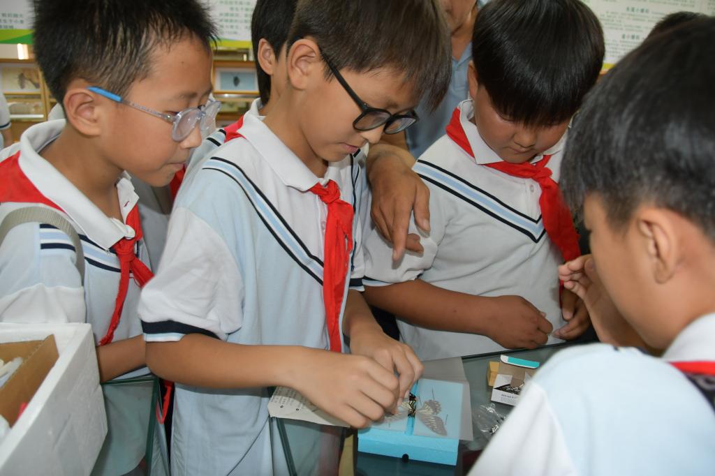 随后,工作人员将昆虫标本采集制作知识向小学生们进行了细致耐心的示范讲解。在志愿者的指导下,学生们亲手尝试制作蝴蝶标本。他们小心翼翼地操作,全神贯注地感受着科学与艺术的交融,完成了属于自己的第一件昆虫标本作品。