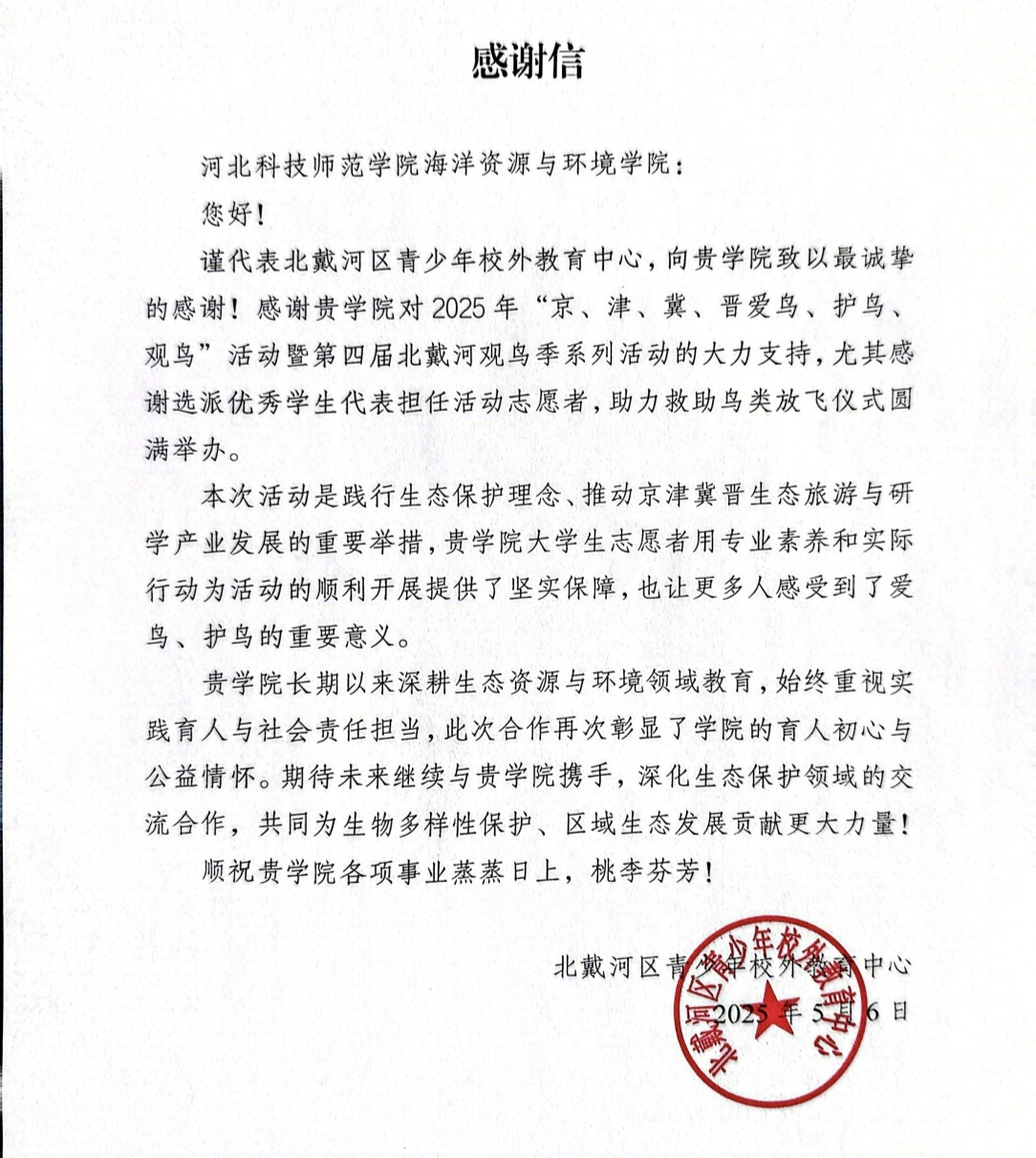 近日,beat365中文官方网站beat365中文官方网站收到了来自北戴河区青少年校外教育中心的感谢信,信中对学院助力2025年“京、津、冀、晋爱鸟、护鸟、观鸟”活动暨第四届北戴河观鸟季系列活动的大力支持表达了诚挚谢意。