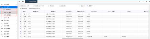 操作菜单为:点击首页快捷菜单【综合查询】或左侧【资产查询】菜单,都可以进入资产查询界面,此处可查询个人在账资产,同时可以进行条件筛选。