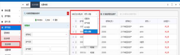 1.如图所示,变动申请,以使用人调整(即院系内使用人调整)为例,当前正在办理业务选择使用人调整。