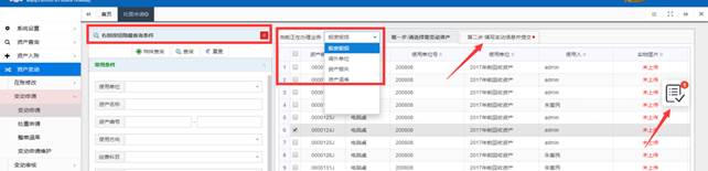 当老师提交完变动申请后,需要由管理员进行审核通过,管理员可通首页待审任务的下拉列表中选择固定资产变动的相关项目,即可查询出相关业务的数据进行终审。